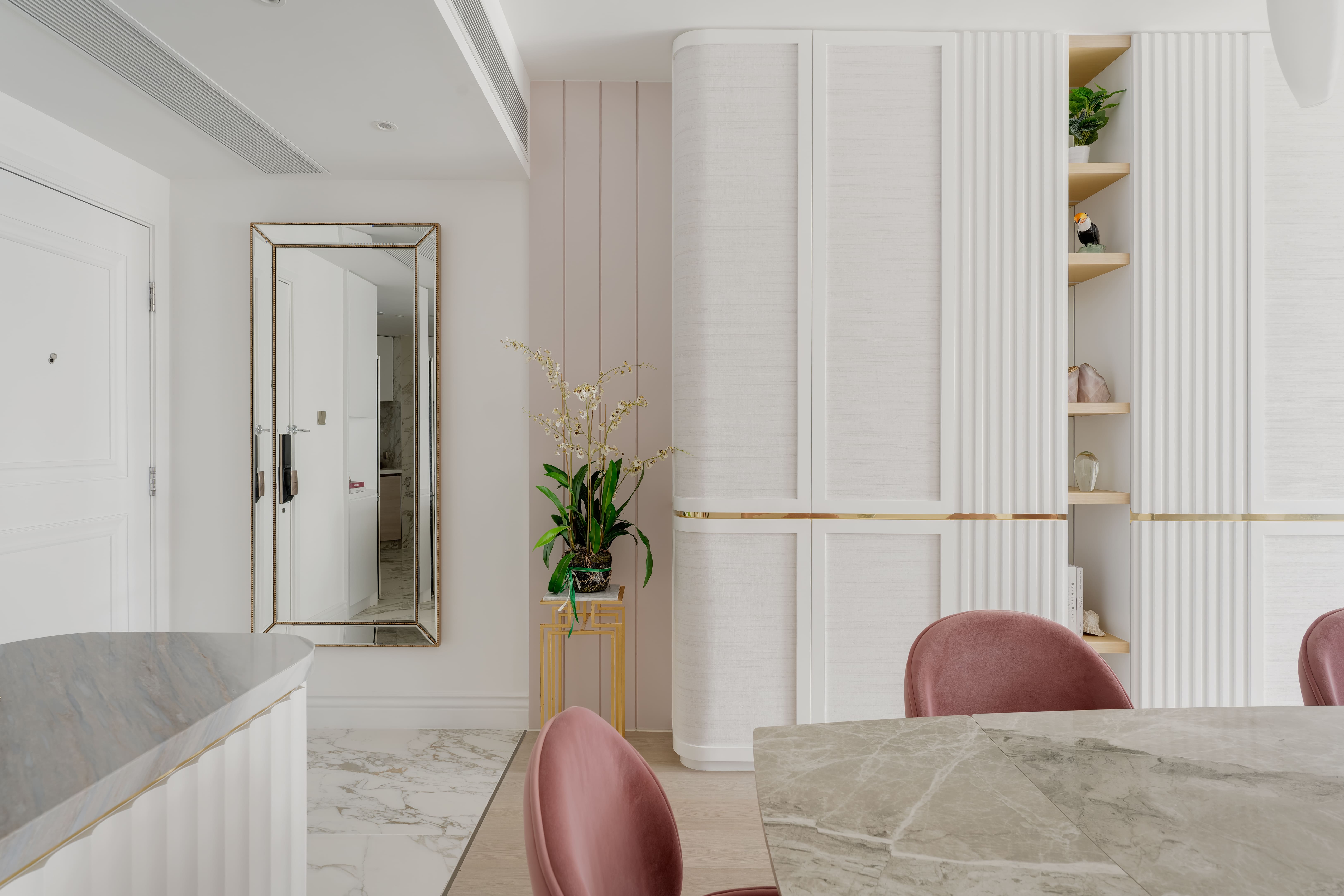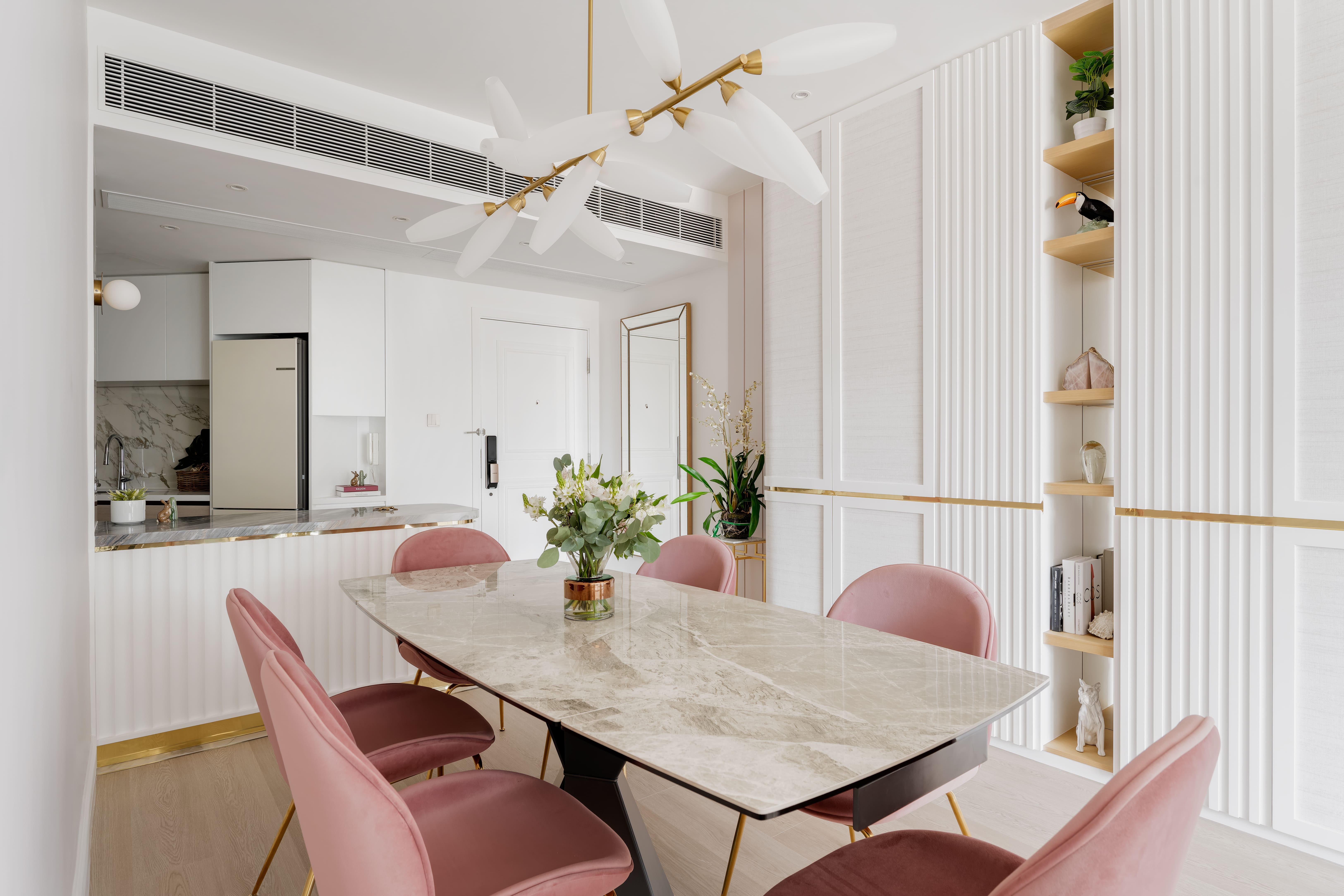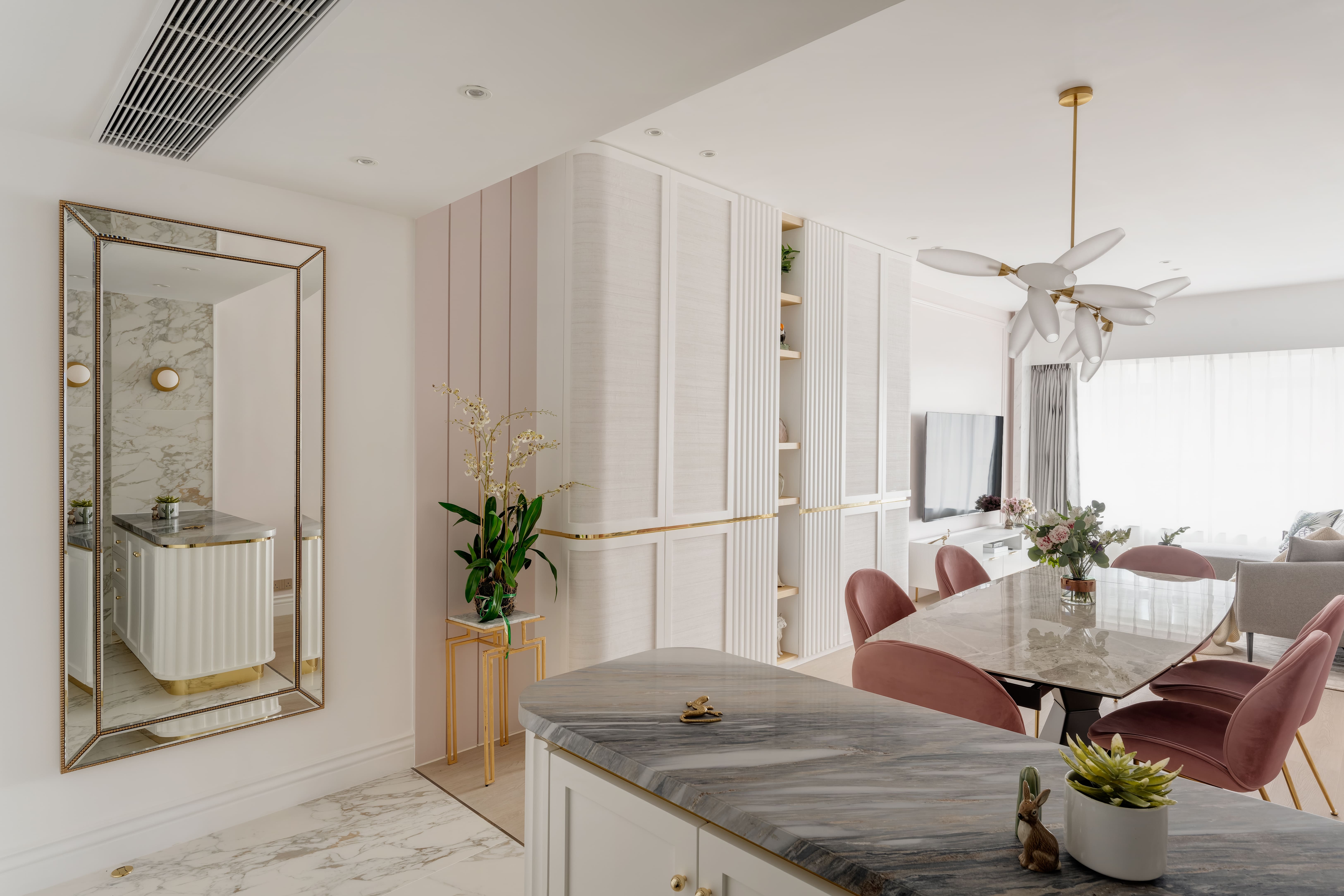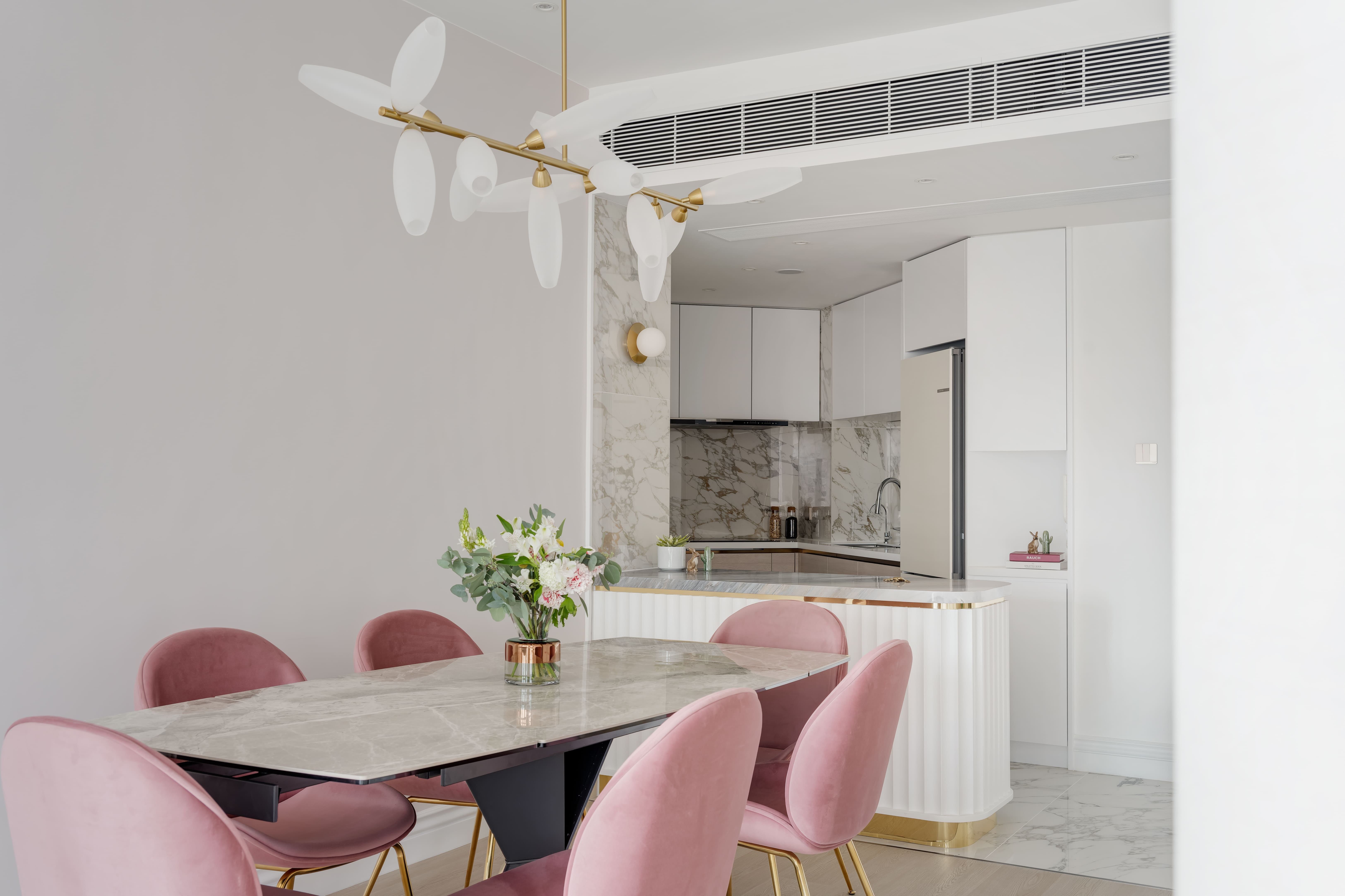 The design is French-inspired, featuring a pearl color theme, exuding an understated and subtly luxurious style. Living and Dining Area: The decoration cabinet has a solitary design, lined with pearl-colored wallpaper. The TV feature wall is adorned with floral moldings and flanked by Jazz White marble, highlighting the elegance and nobility of the pearl theme. Open Kitchen Area: The walls have been removed to create an open kitchen, making the space larger and better lit. The bar counter uses natural Blue Bahia granite, with its natural patterns and specks of gold sand material, it appears under the wall lights as if finding a pearl on the beach. Master Bedroom: The master bedroom is mainly decorated in silver and khaki tones, giving off a peaceful and comfortable feel. The silver botanical wallpaper introduces a sense of freshness and nature without the chaos of a forest. Master Bathroom: The bathroom features marble tiles with a pearl shell finish, reminiscent of enjoying a sunbath on the beach.