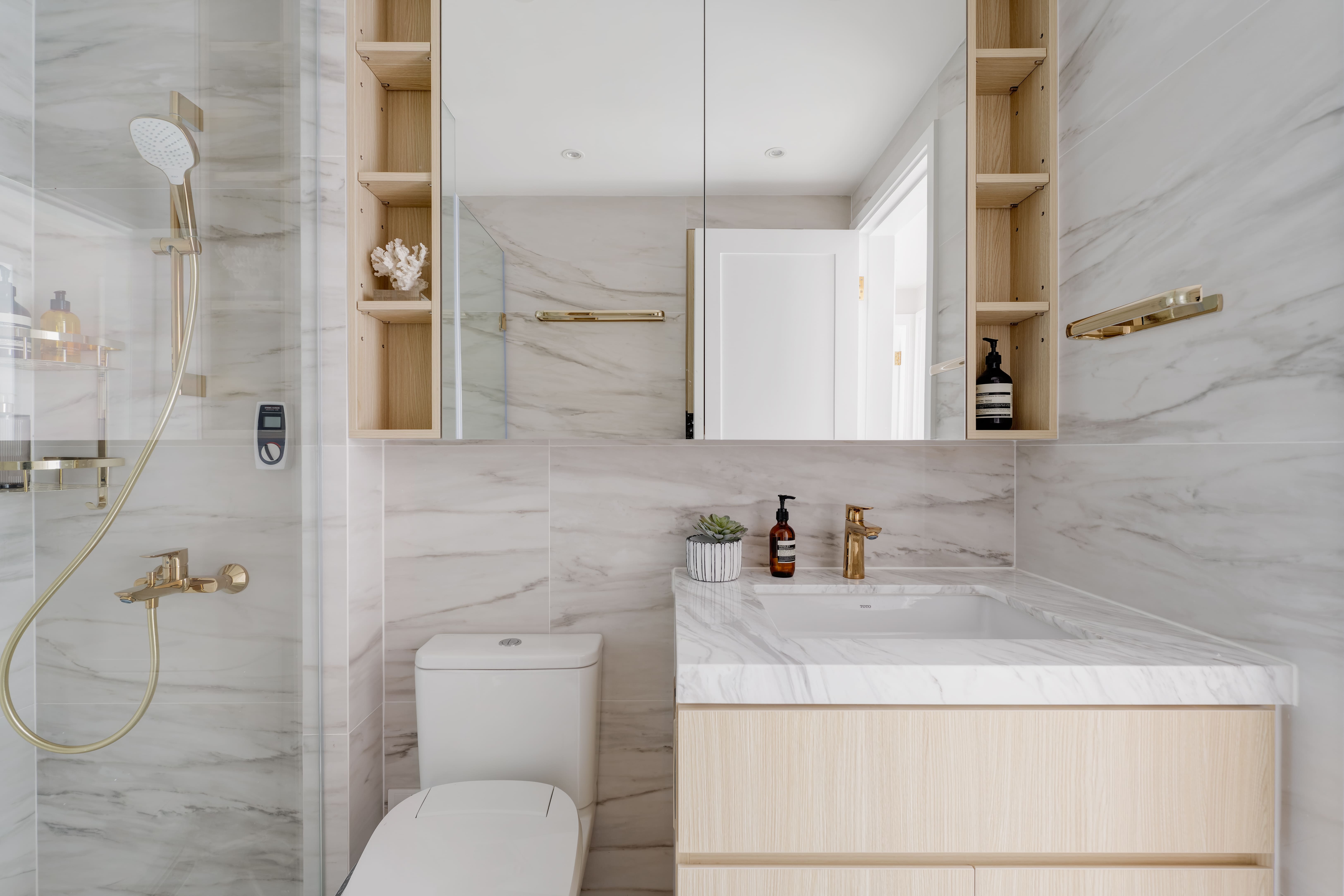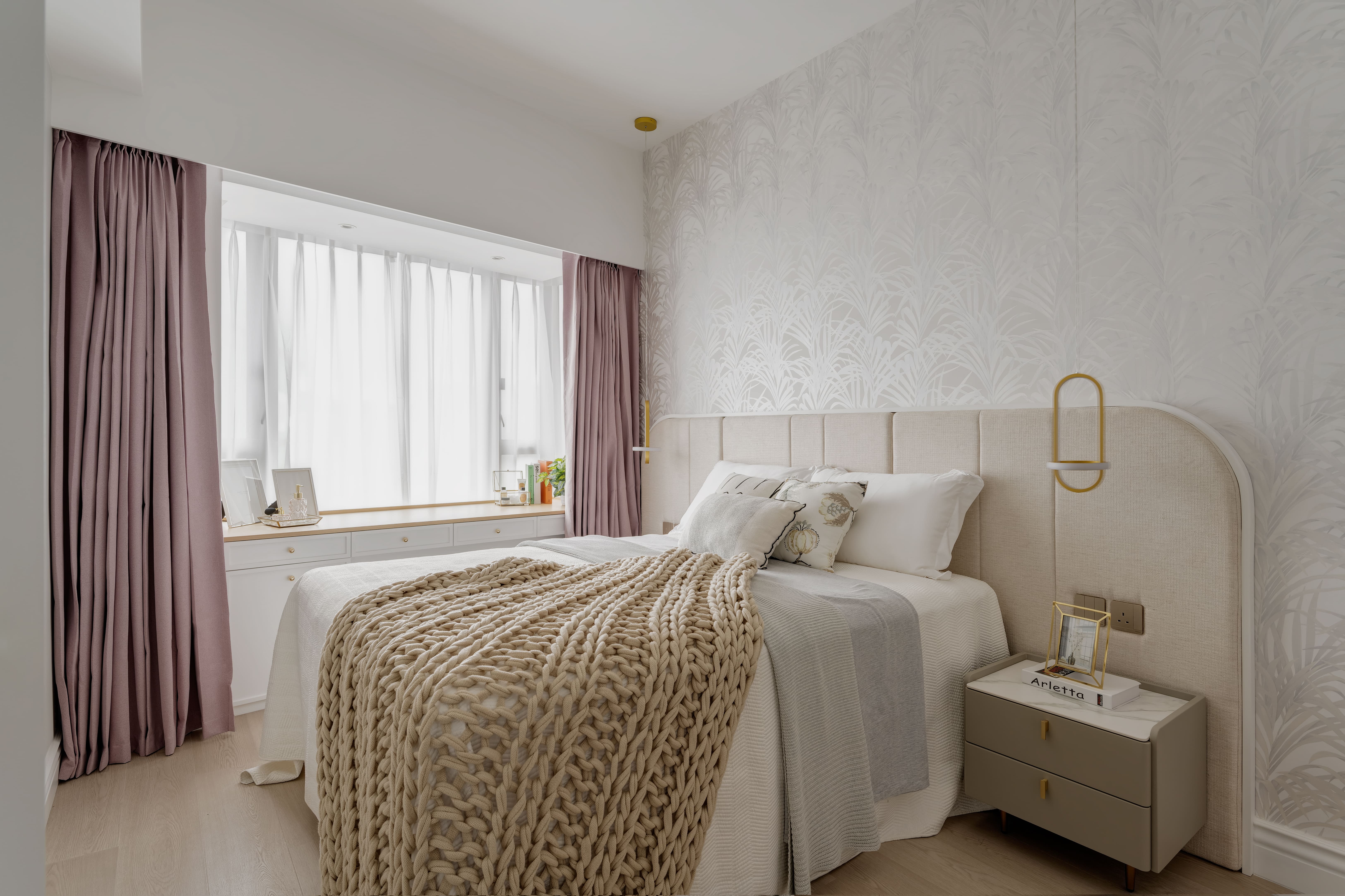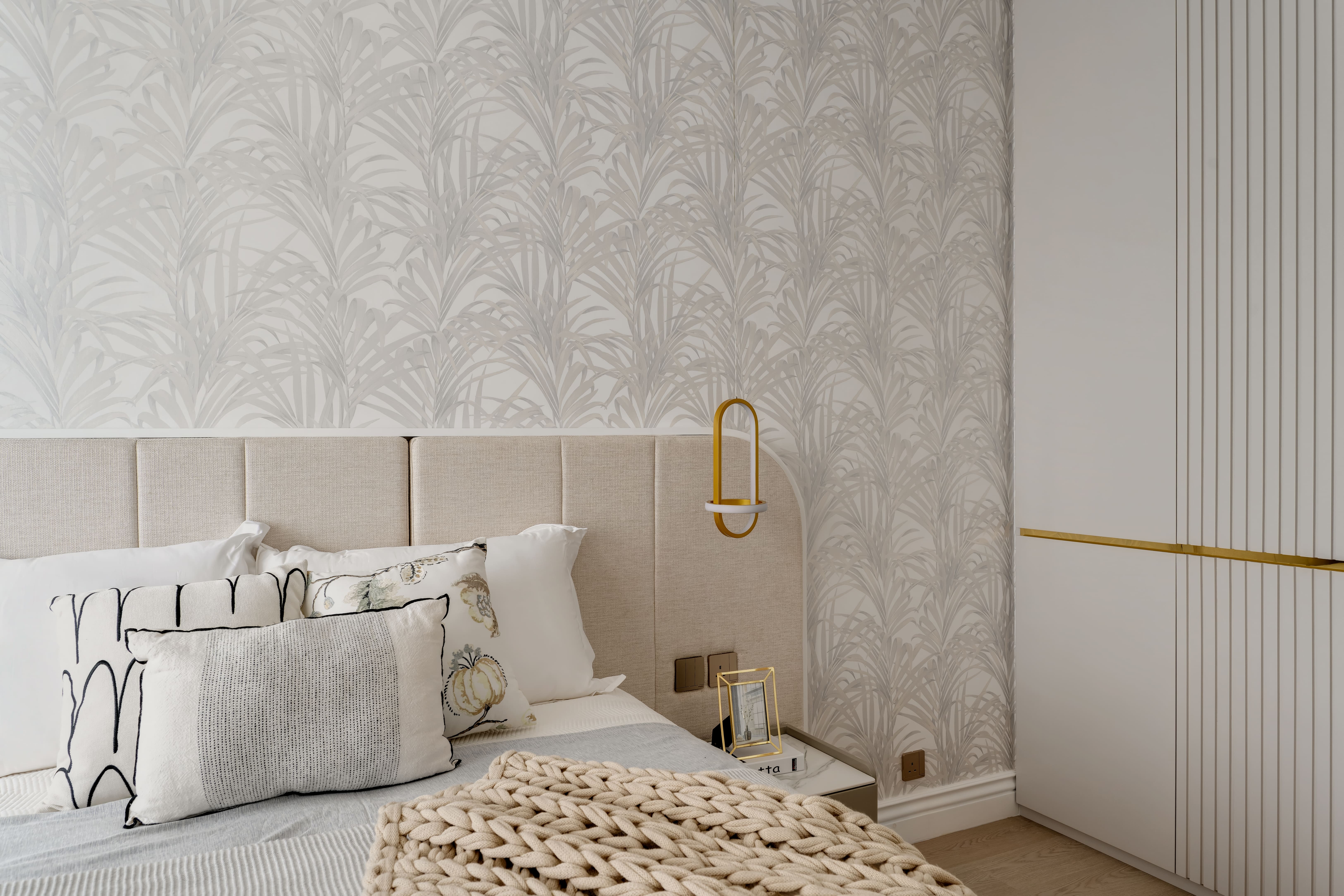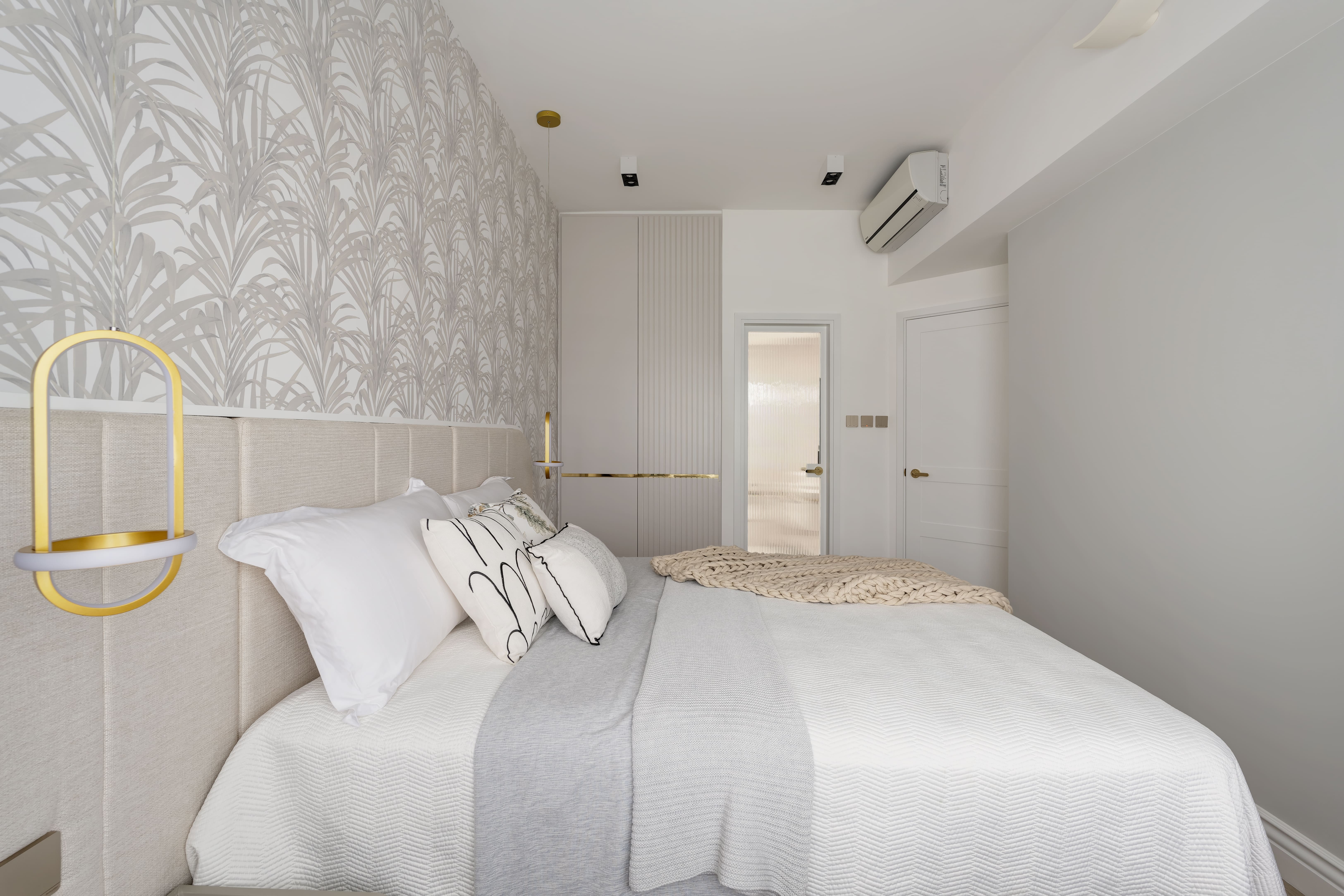 The design is French-inspired, featuring a pearl color theme, exuding an understated and subtly luxurious style. Living and Dining Area: The decoration cabinet has a solitary design, lined with pearl-colored wallpaper. The TV feature wall is adorned with floral moldings and flanked by Jazz White marble, highlighting the elegance and nobility of the pearl theme. Open Kitchen Area: The walls have been removed to create an open kitchen, making the space larger and better lit. The bar counter uses natural Blue Bahia granite, with its natural patterns and specks of gold sand material, it appears under the wall lights as if finding a pearl on the beach. Master Bedroom: The master bedroom is mainly decorated in silver and khaki tones, giving off a peaceful and comfortable feel. The silver botanical wallpaper introduces a sense of freshness and nature without the chaos of a forest. Master Bathroom: The bathroom features marble tiles with a pearl shell finish, reminiscent of enjoying a sunbath on the beach.