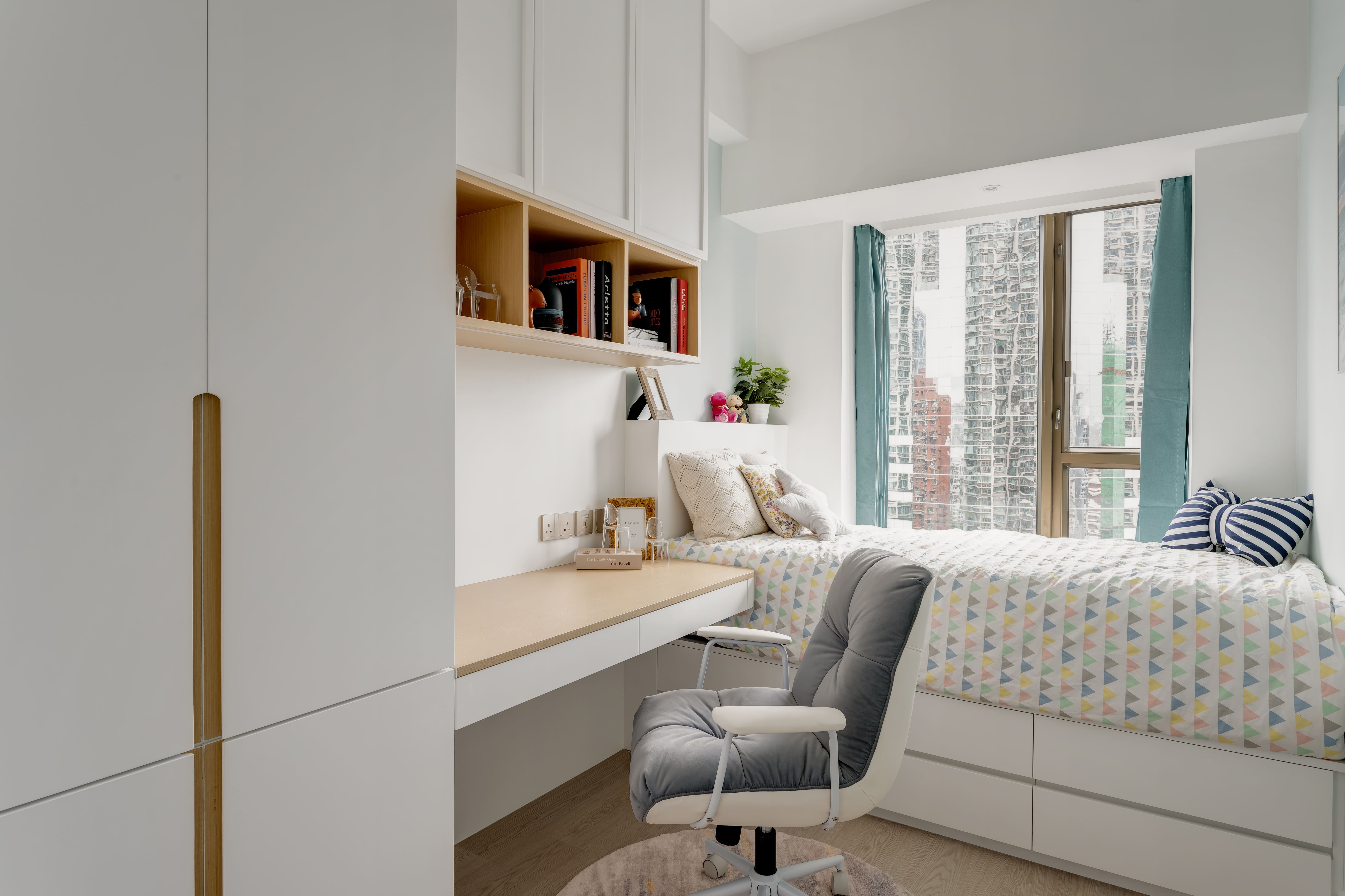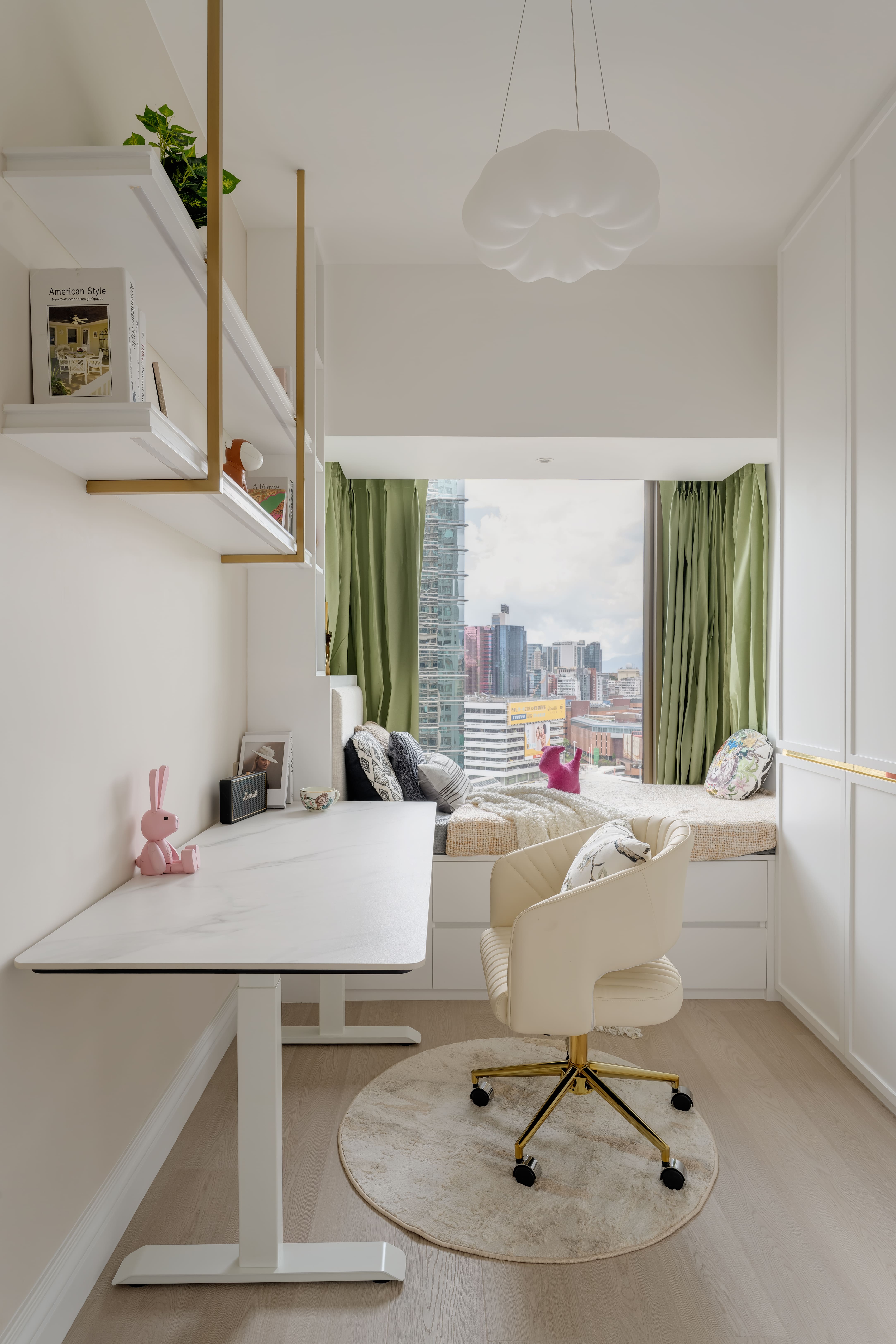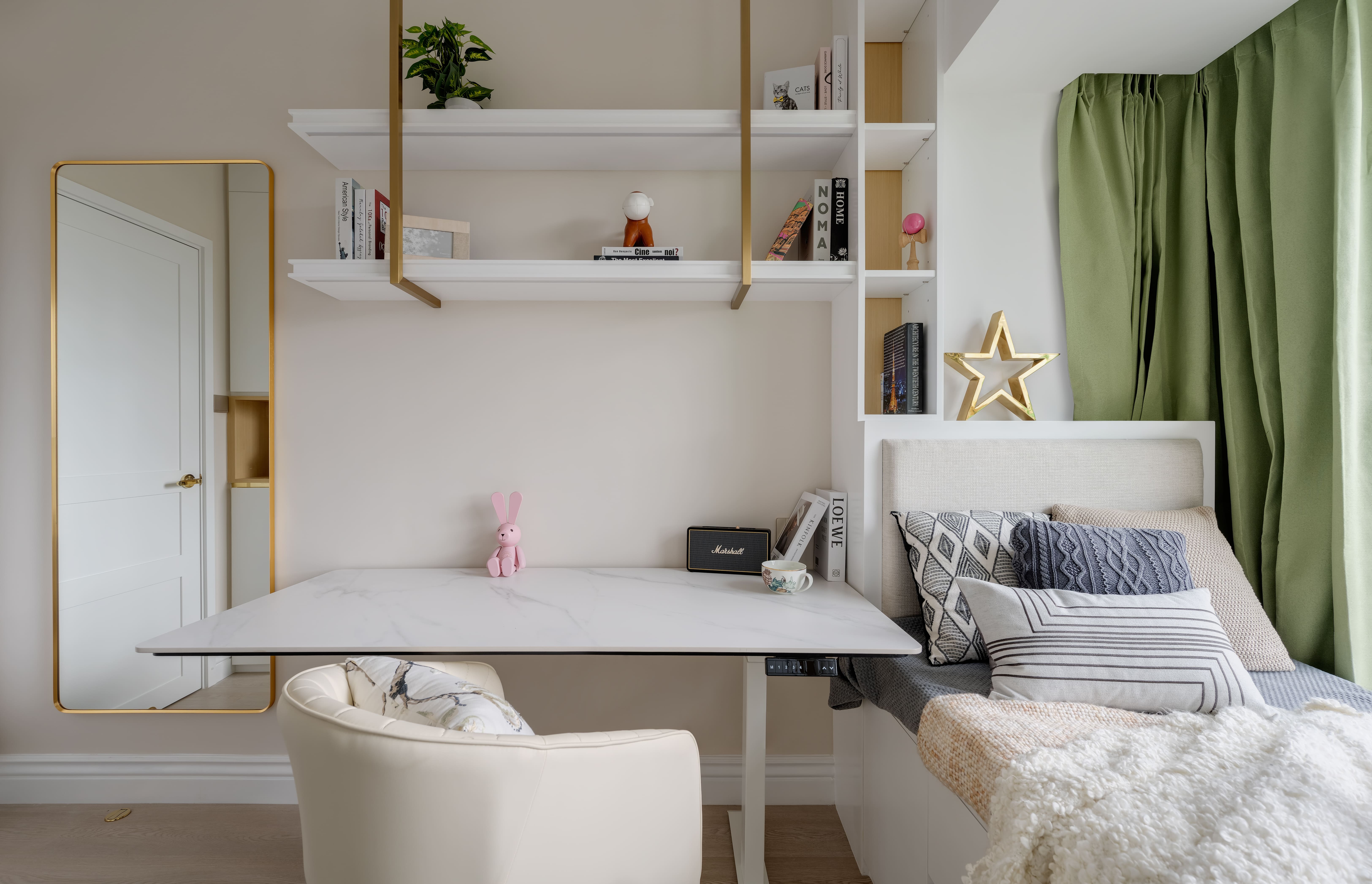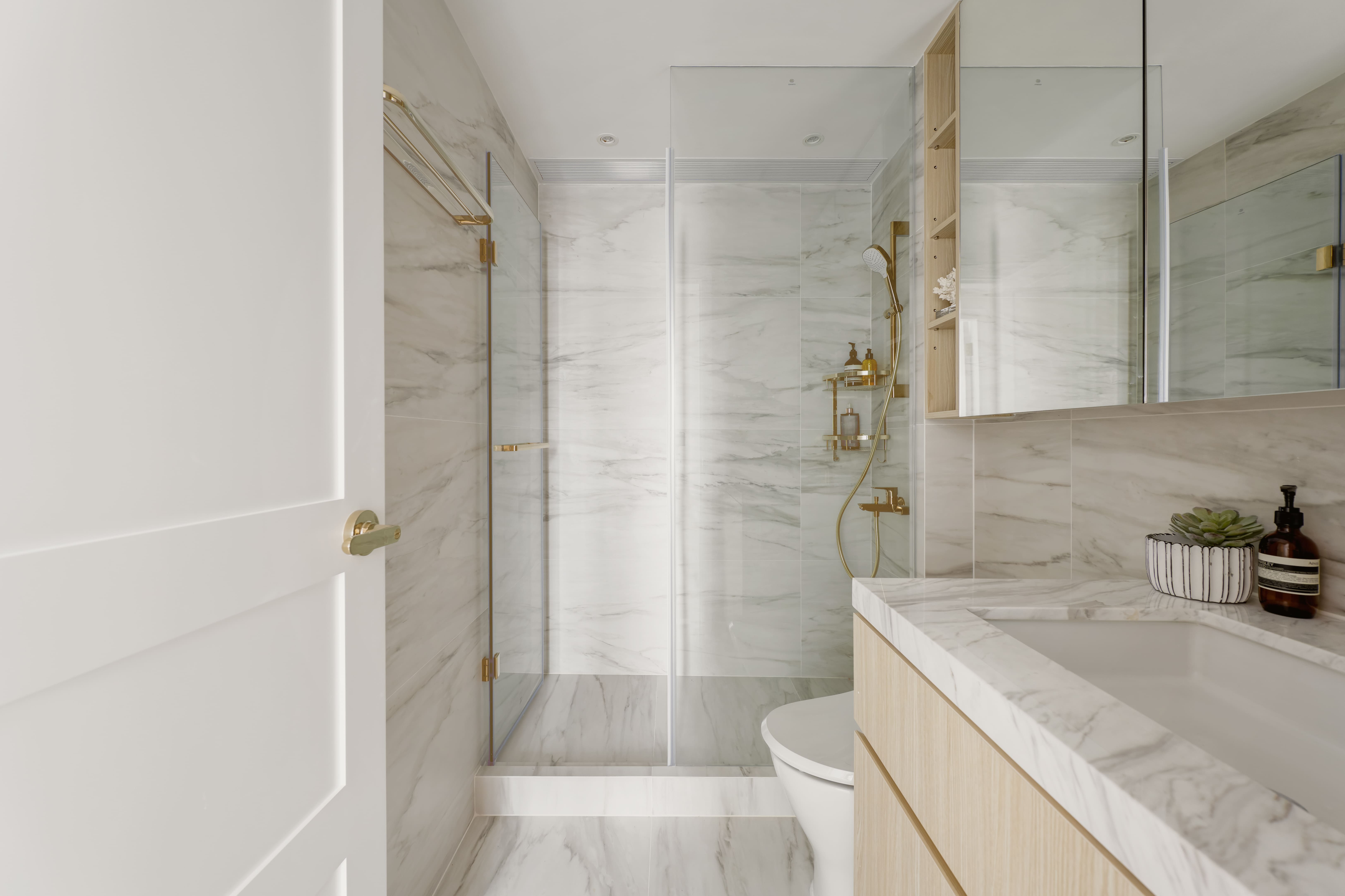 The design is French-inspired, featuring a pearl color theme, exuding an understated and subtly luxurious style. Living and Dining Area: The decoration cabinet has a solitary design, lined with pearl-colored wallpaper. The TV feature wall is adorned with floral moldings and flanked by Jazz White marble, highlighting the elegance and nobility of the pearl theme. Open Kitchen Area: The walls have been removed to create an open kitchen, making the space larger and better lit. The bar counter uses natural Blue Bahia granite, with its natural patterns and specks of gold sand material, it appears under the wall lights as if finding a pearl on the beach. Master Bedroom: The master bedroom is mainly decorated in silver and khaki tones, giving off a peaceful and comfortable feel. The silver botanical wallpaper introduces a sense of freshness and nature without the chaos of a forest. Master Bathroom: The bathroom features marble tiles with a pearl shell finish, reminiscent of enjoying a sunbath on the beach.