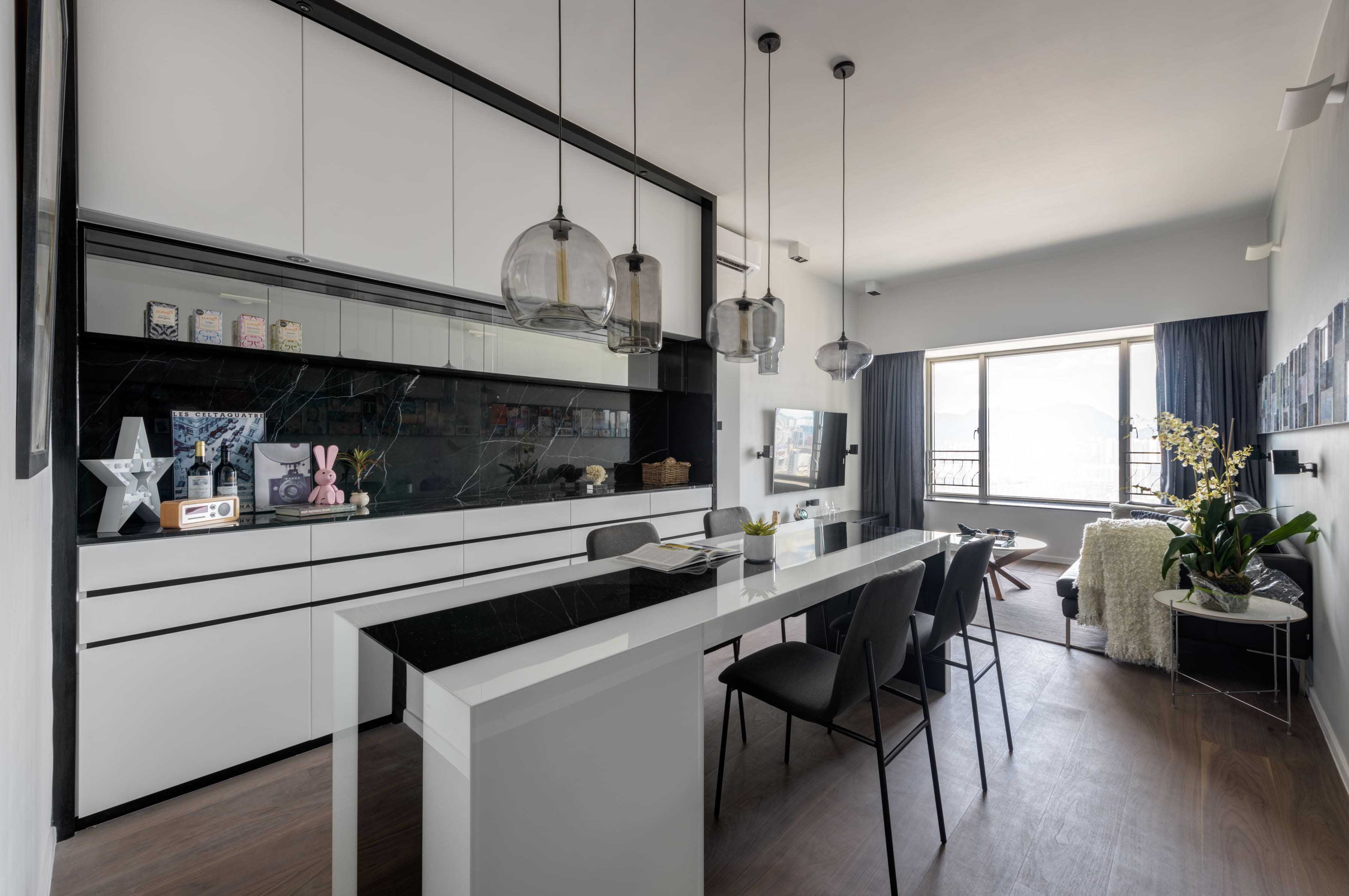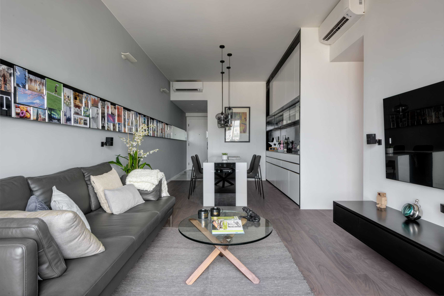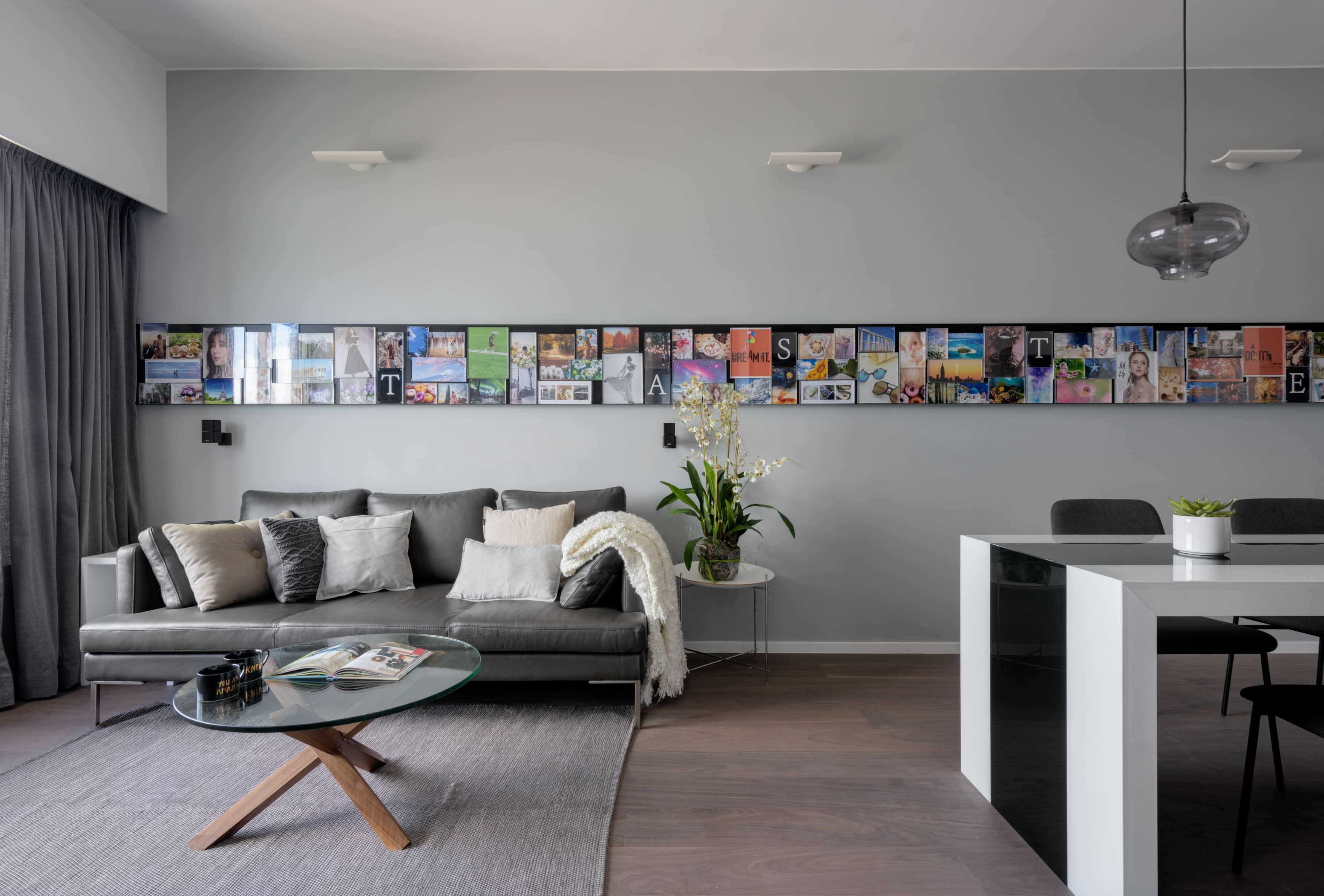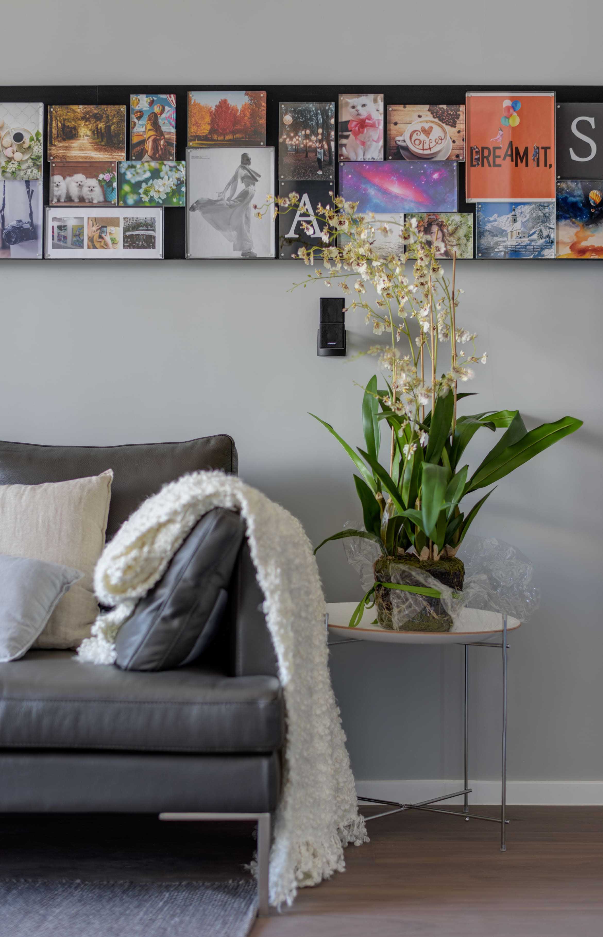 这个单位以深色地板配以浅灰色及黑色云石做配搭,梳化背的墙身我们特别设计了一幅回忆墙,方便户主摆方相片.