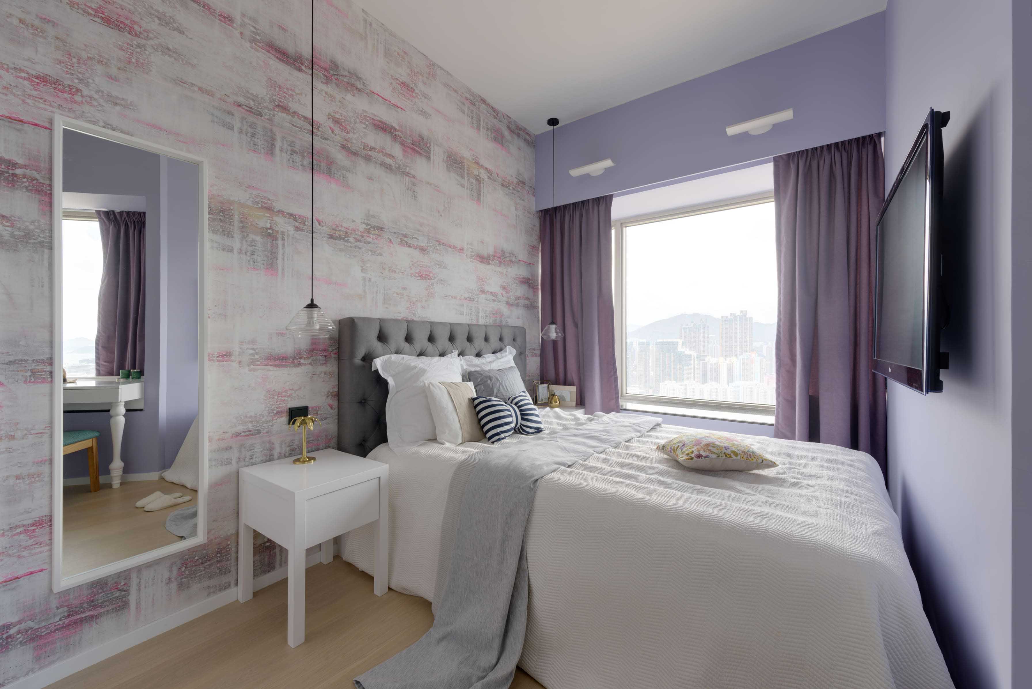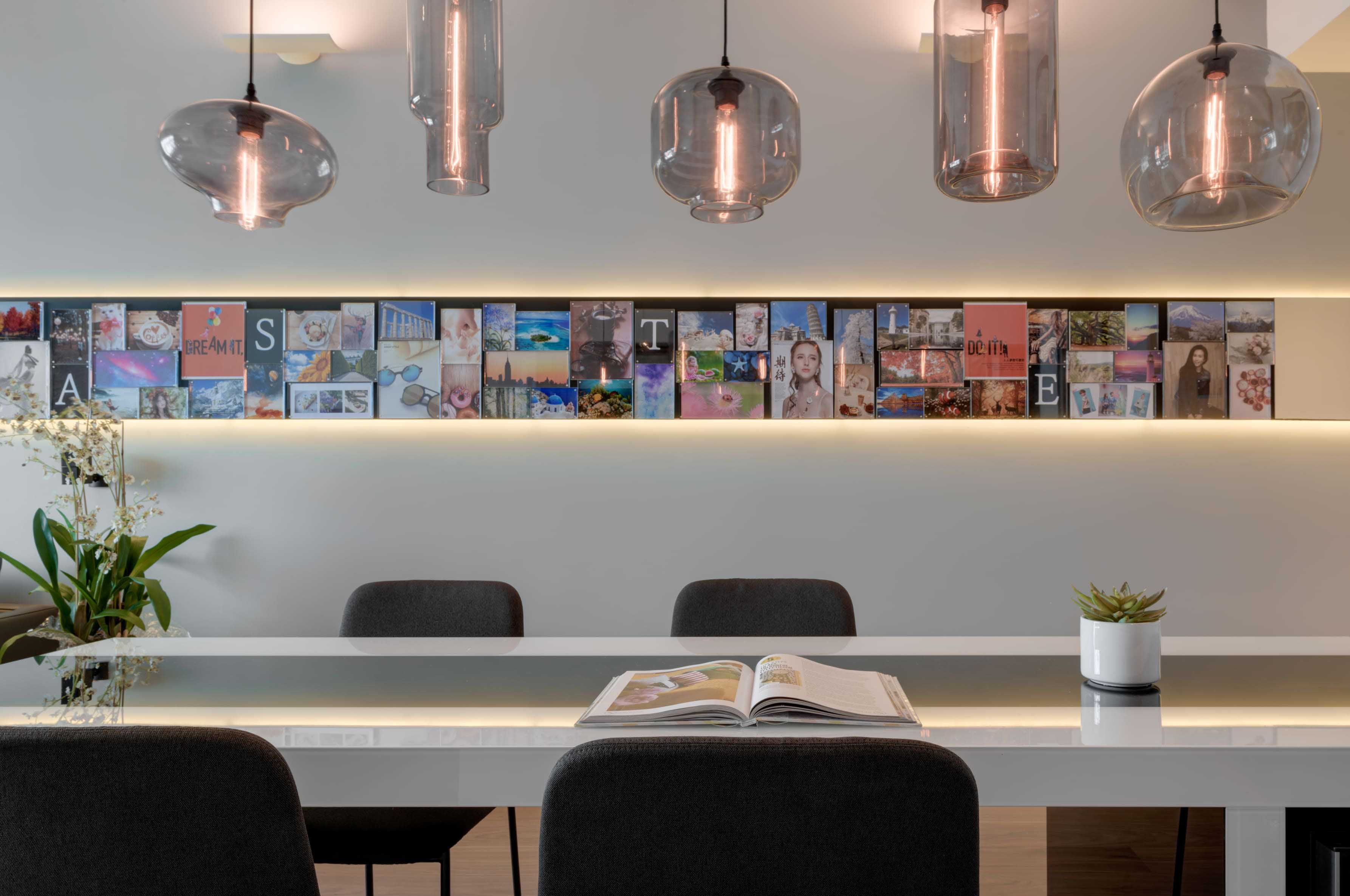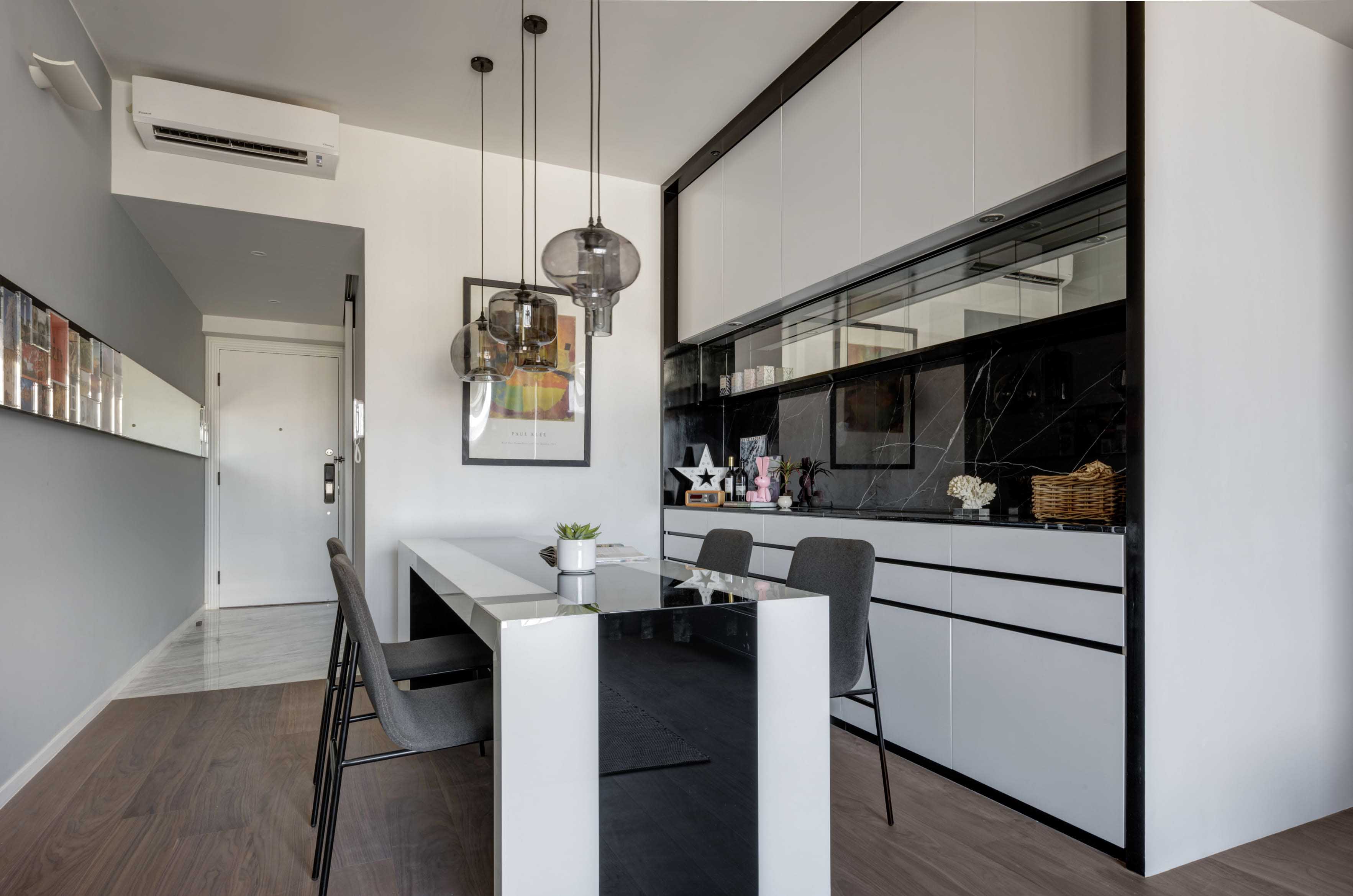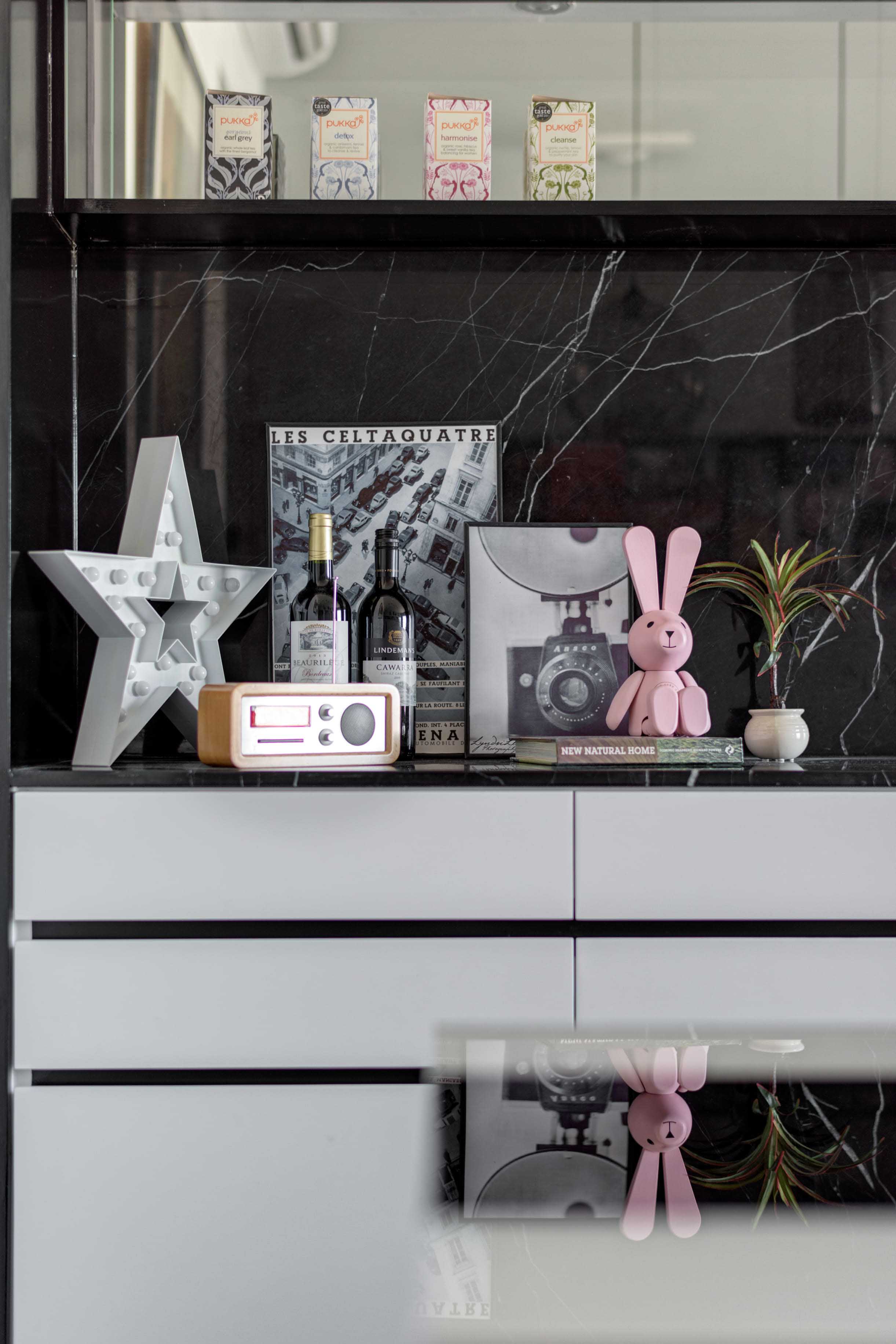 这个单位以深色地板配以浅灰色及黑色云石做配搭,梳化背的墙身我们特别设计了一幅回忆墙,方便户主摆方相片.